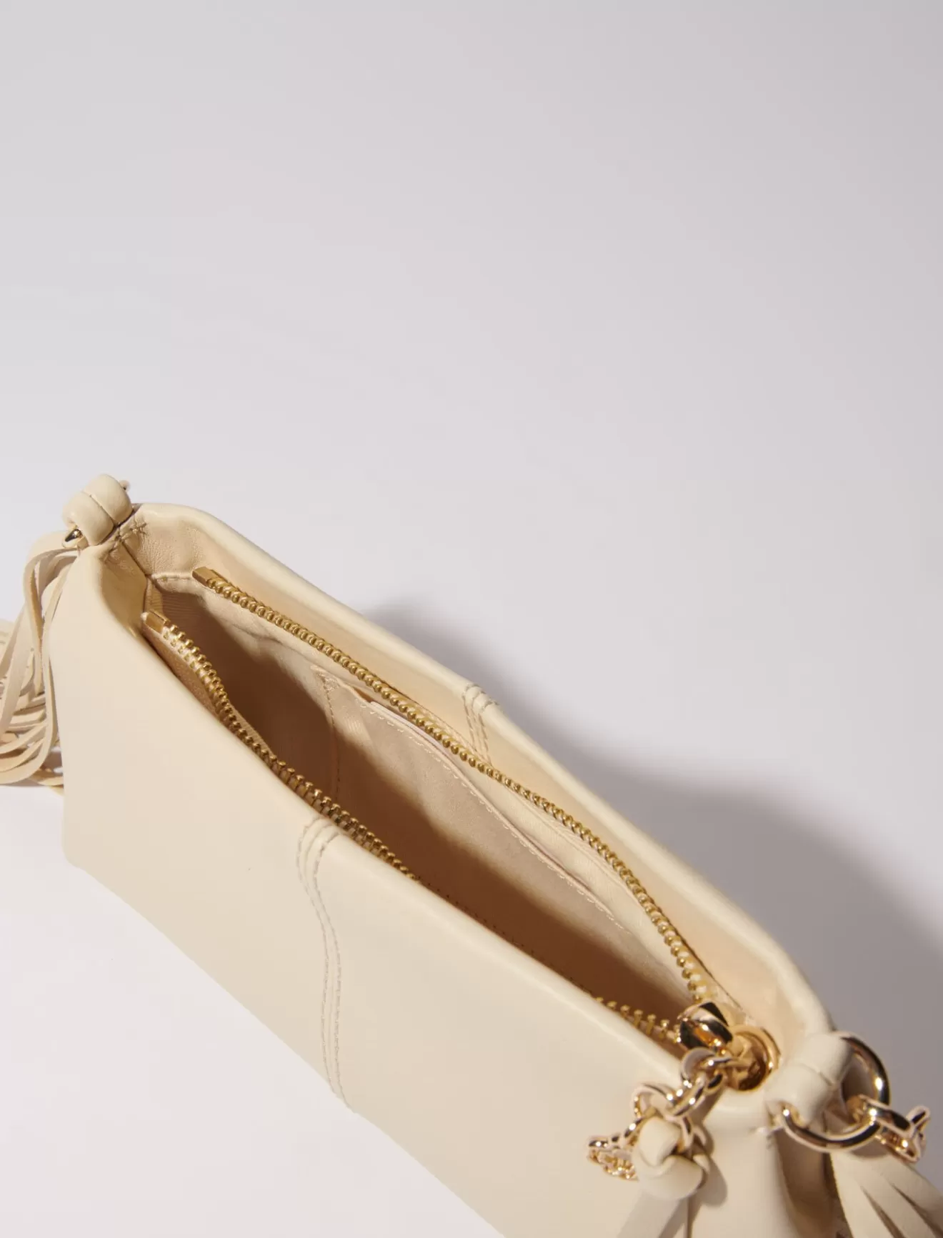 L’emblématique sac Miss M se décline dans une version pochette à la fois chic et pratique. Confectionnée en cuir, elle est munie d’une anse chaîne amovible offrant un porté à l’épaule ou à la main, et ornée des franges emblématiques de Maje sur les côtés. Une tirette en cuir ponctuée d’une pampille clover permet d’ouvrir sa fermeture zippée, et d’y glisser tous ses essentiels.